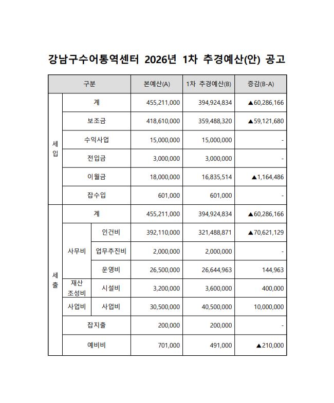 2026년 강남구수어통역센터 1차 추경예산(안) 공고