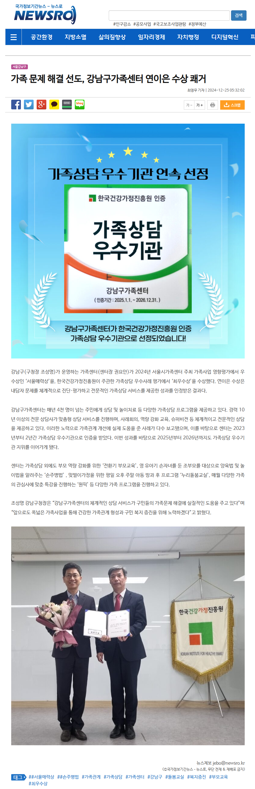 1225_가족 문제 해결 선도, 강남구가족센터 연이은 수상 쾌거_뉴스로(인터넷).png