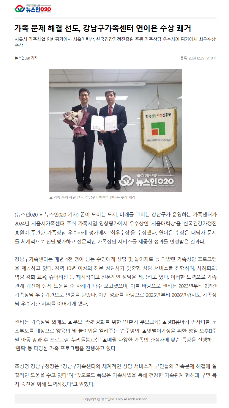 1225_가족 문제 해결 선도, 강남구가족센터 연이은 수상 쾌거_뉴스인020(인터넷).png