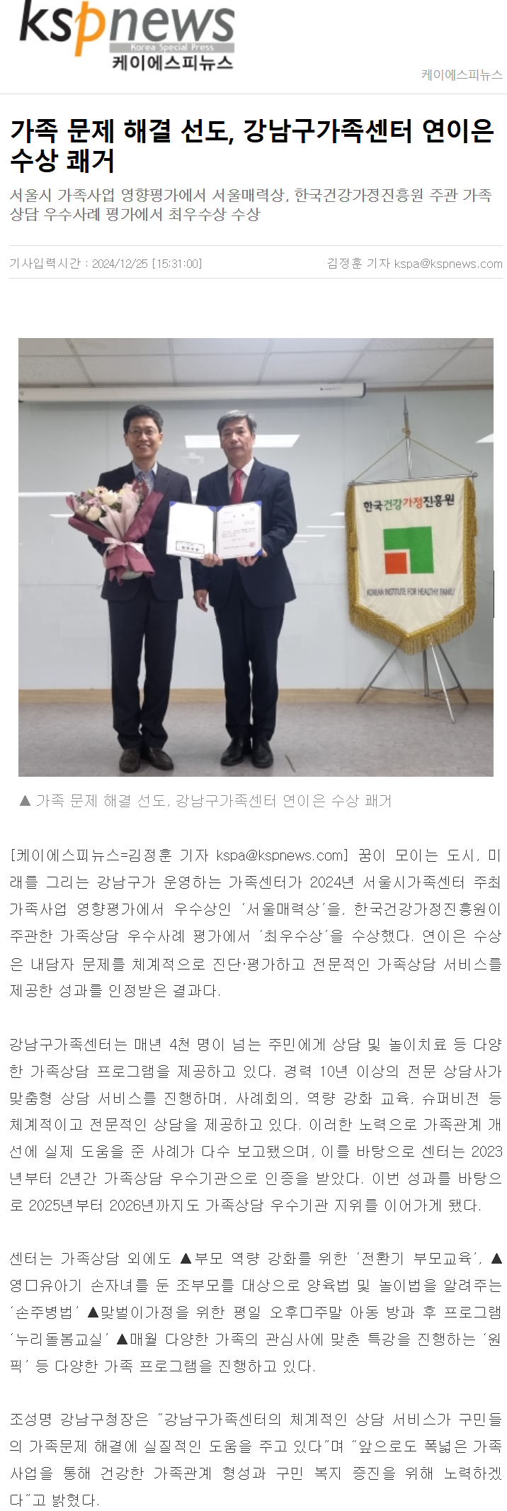 1225_가족 문제 해결 선도, 강남구가족센터 연이은 수상 쾌거_케이에스피뉴스(인터넷).png