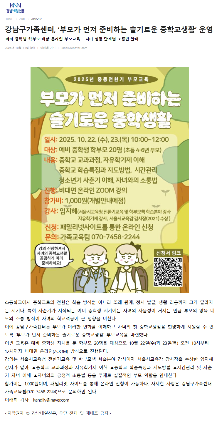 1014_강남구가족센터, ‘부모가 먼저 준비하는 슬기로운 중학교생활’ 운영_강남내일신문(인터넷).png