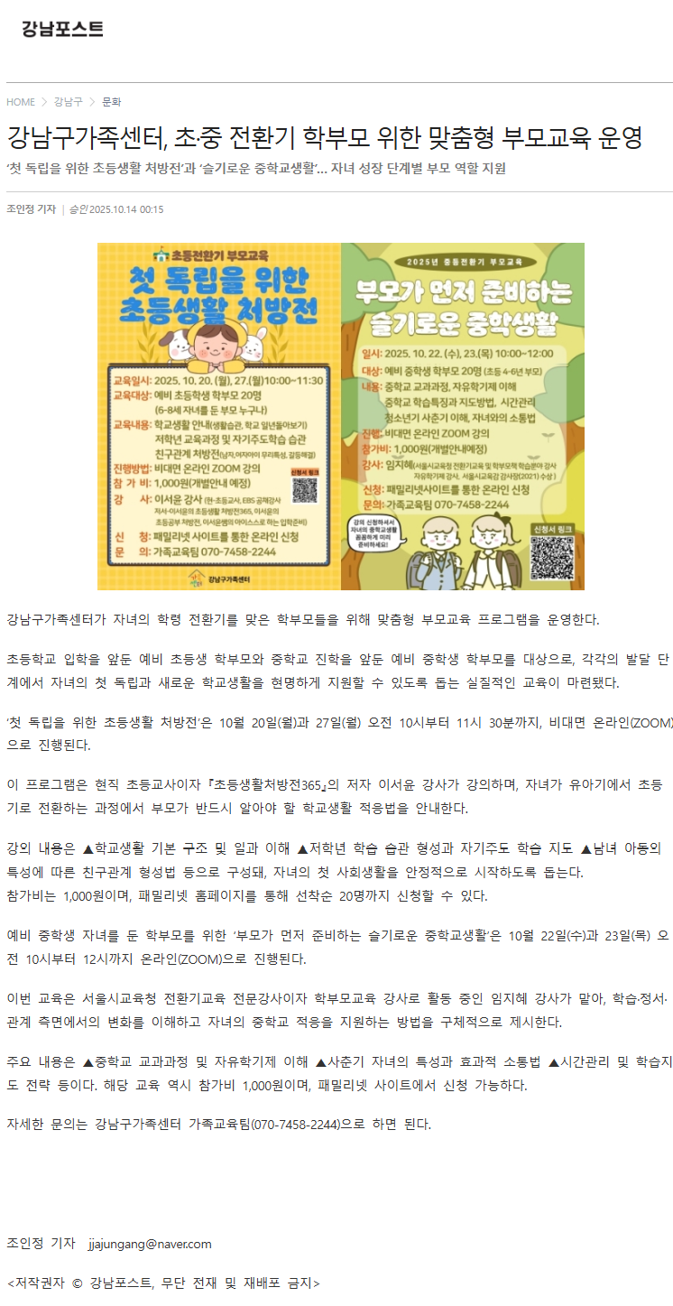 1014_강남구가족센터, 초·중 전환기 학부모 위한 맞춤형 부모교육 운영_강남포스트(인터넷).png