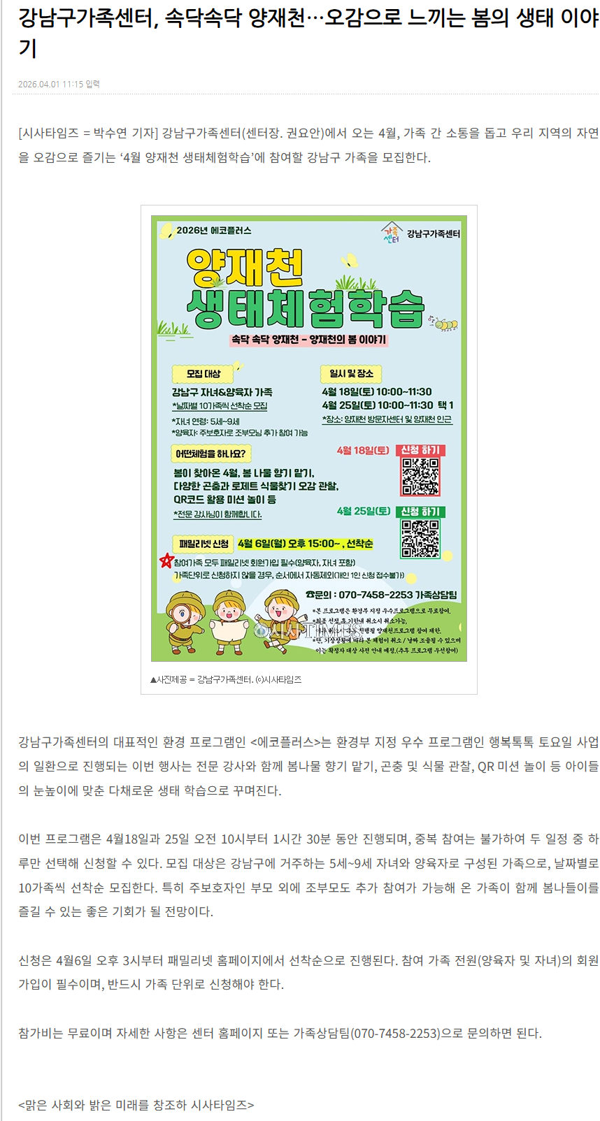0401_강남구가족센터, 속닥속닥 양재천...오감으로 느끼는 봄의 생태 이야기_시사타임즈(인터넷).png
