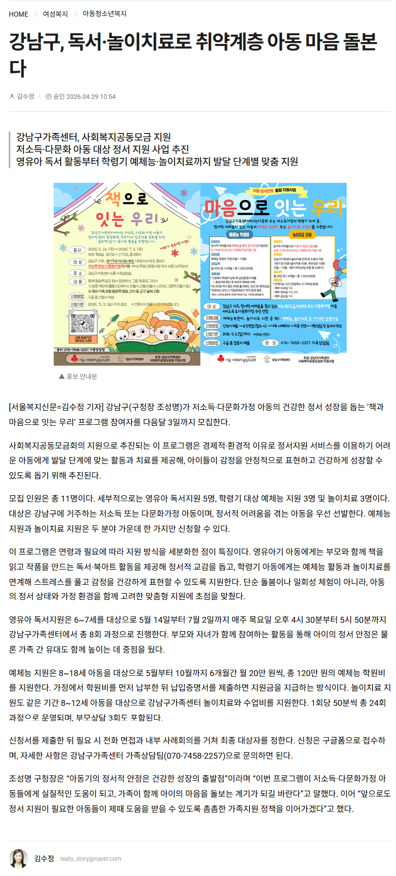 0429_강남구, 독서놀이치료로 취약계층 아동 마음 돌본다_서울복지신문(인터넷 기사).png