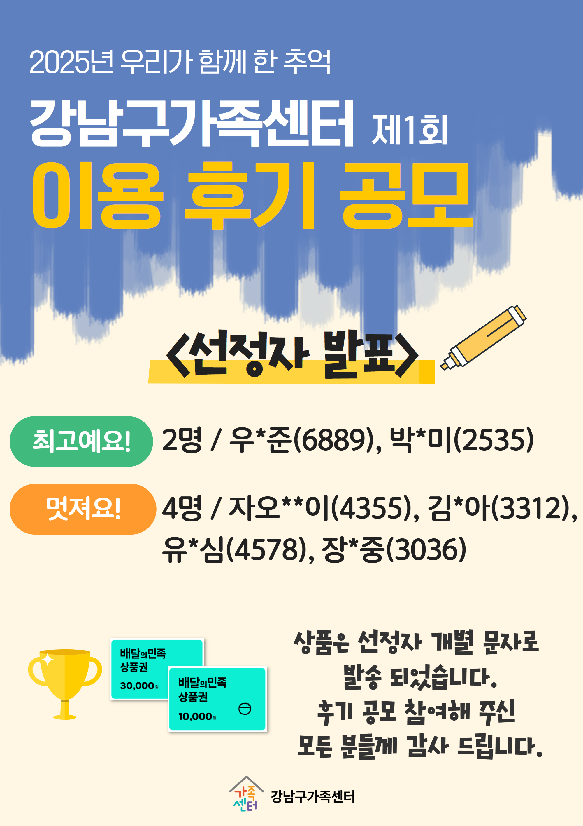 2025 강남구가족센터 이용 후기 공모 선정자를 다음과 같이 안내 합니다.