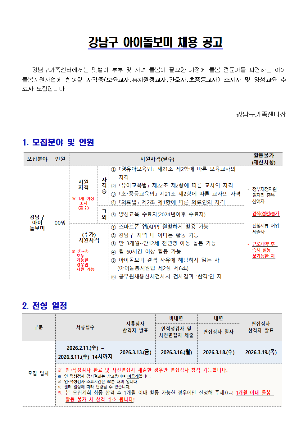 [아이돌봄] 2026년 1차 강남구 신규 아이돌보미 채용 공고