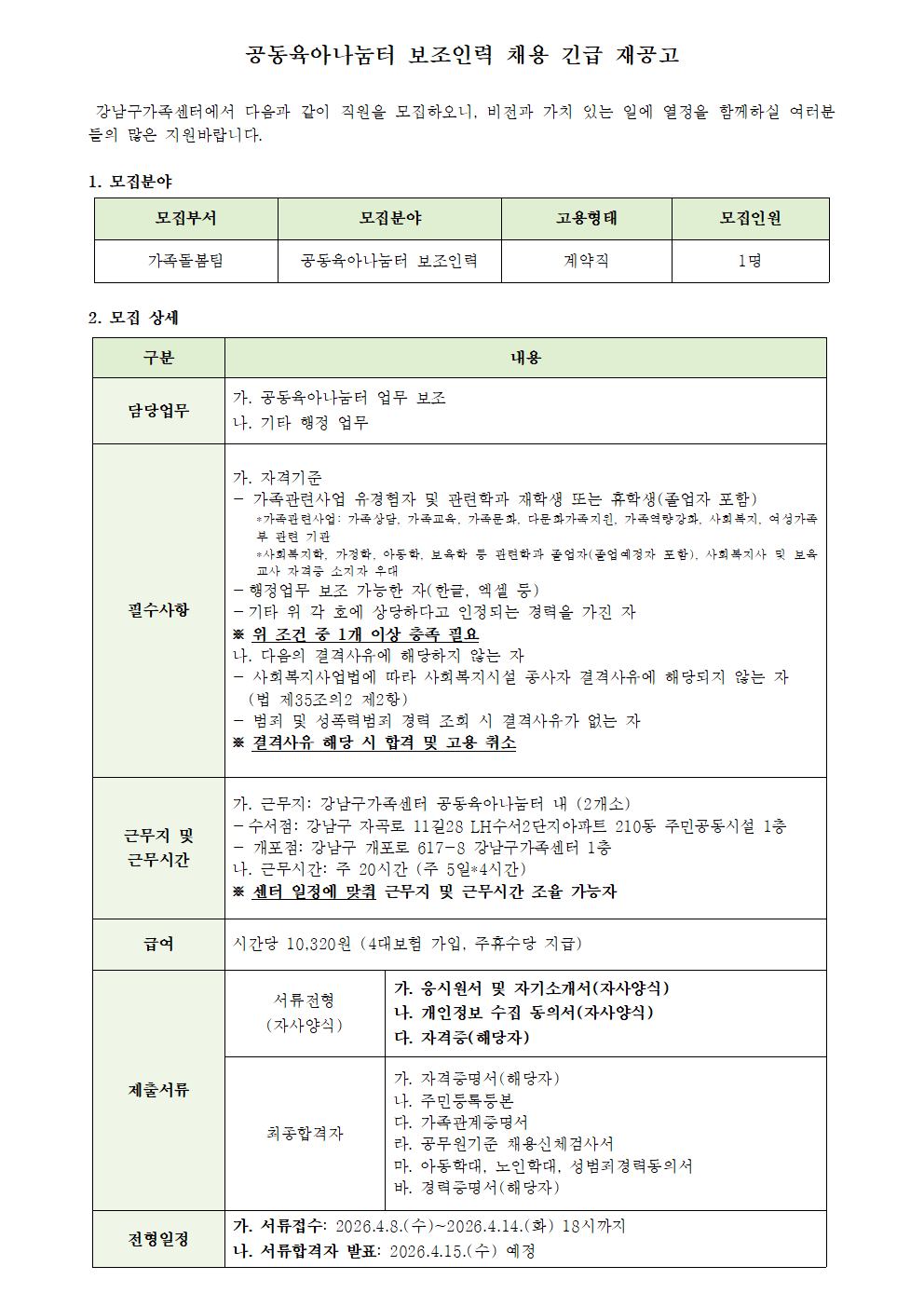 [공동육아나눔터] 2026년 보조인력 채용 긴급 재공고