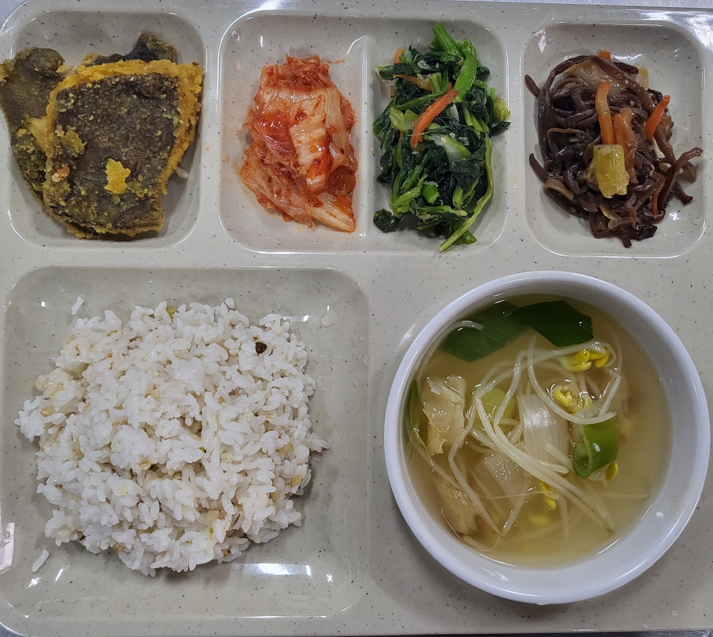 <석식 : 잡곡밥, 북어국, 가자미구이, 목이버섯볶음, 근대나물, 배추김치>