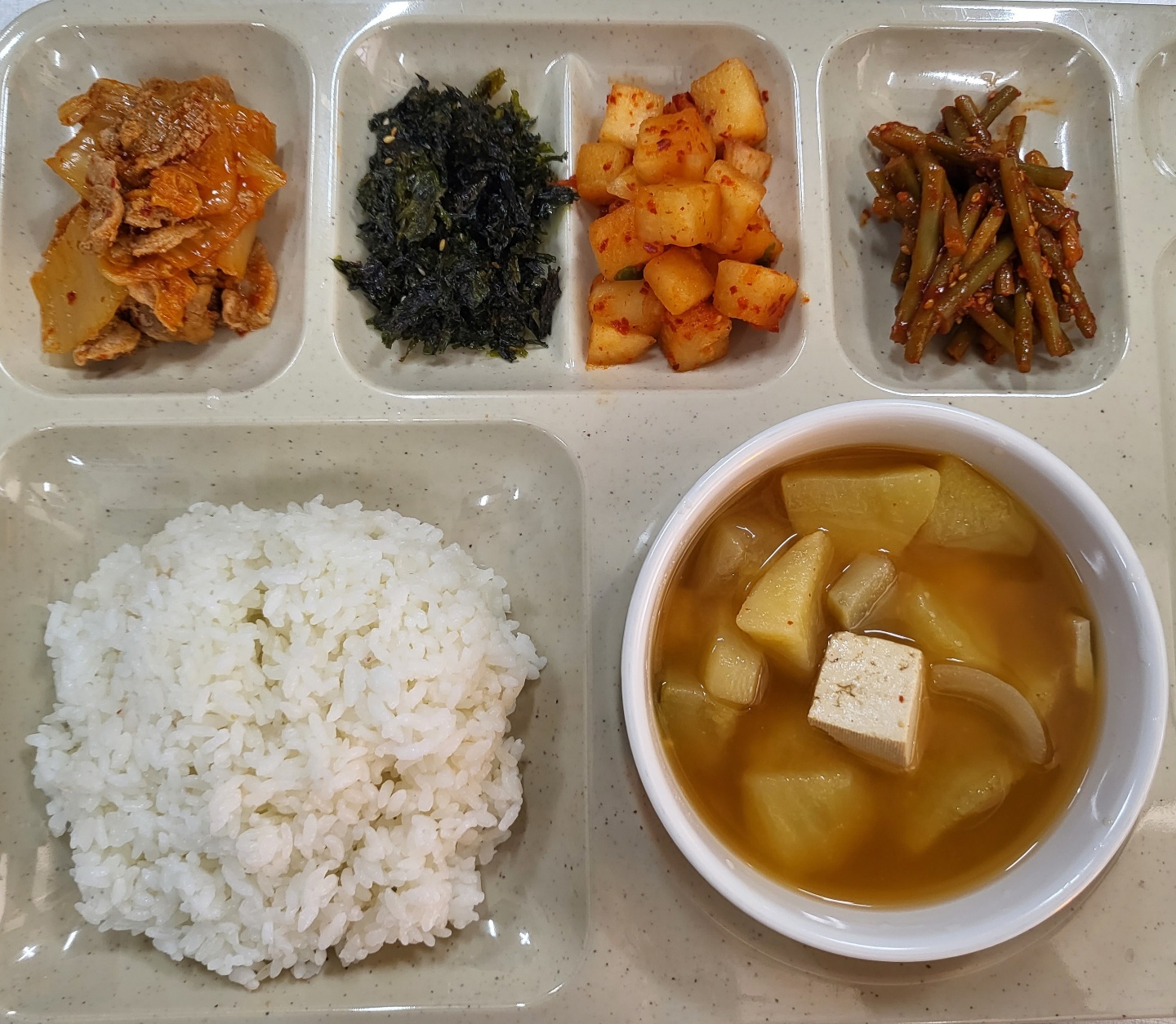 <중식 :백미밥, 감자호박된장국, 돈육김치볶음, 마늘종지, 돌김파래자반, 깍두기>