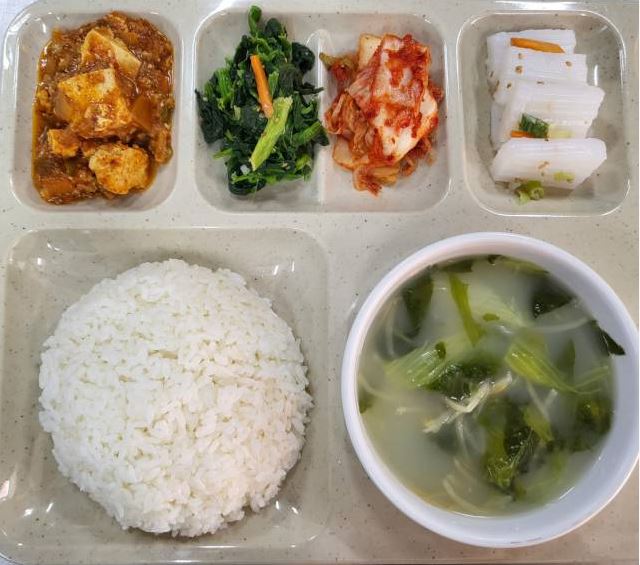 <중식 : 백미밥, 사골우거지국, 마파두부, 청포묵무침, 시금치나물, 배추김치>
