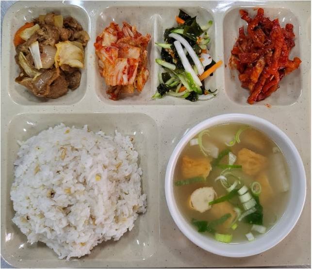 <석식 : 잡곡밥, 어묵국, 돈육간장볶음, 건미역초무침, 무말랭이무침, 배추김치>