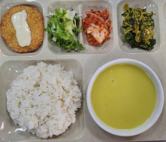 <석식 : 백미밥, 크림스프, 새우까스&소스, 얼갈이나물, 양상추샐러드, 배추김치>