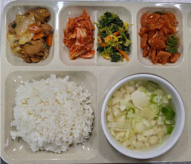 <석식 : 잡곡밥, 순두부백탕, 닭살야채볶음, 근대나물, 오복지무침, 배추김치>