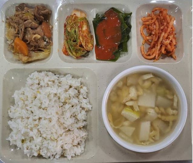 <석식 : 잡곡밥, 유부맑은국, 돈육굴소스볶음, 다시마&초장, 무생채, 배추김치>