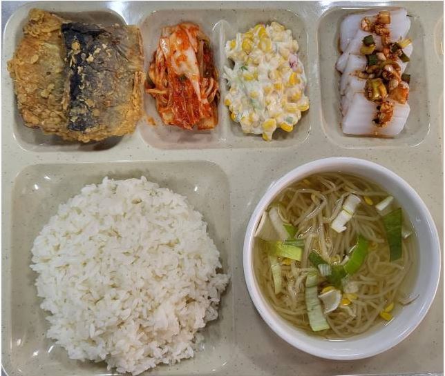<중식 : 백미밥, 콩나물국, 청어구이, 옥수수콘샐러드, 청포묵무침, 배추김치>