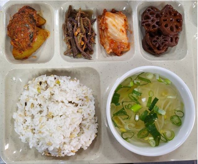 <석식 : 잡곡밥, 콩나물국, 고등어무조림, 고사리나물, 연근조림, 배추김치>