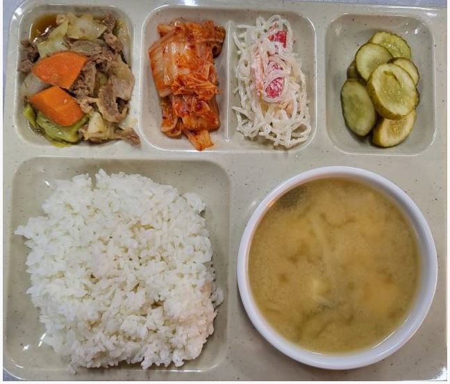<중식 : 백미밥, 호박된장국, 돈육굴소스볶음, 천사채무침, 오이피클, 배추김치>