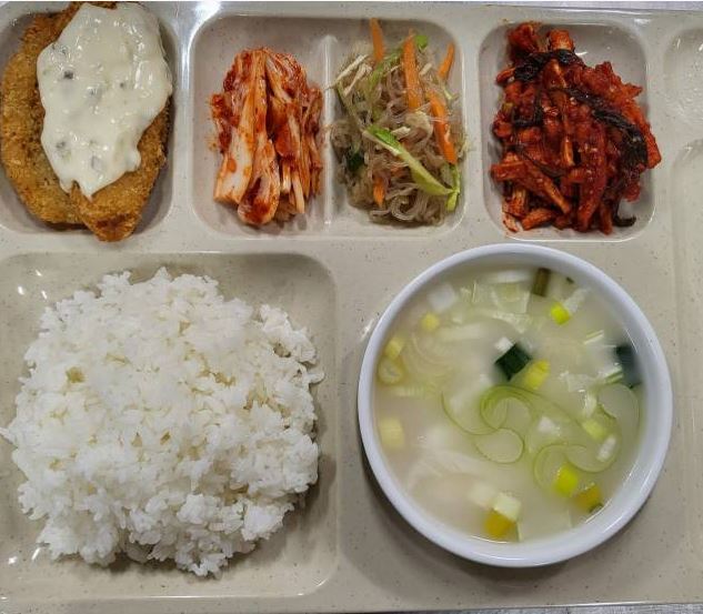 <중식 : 백미밥, 조랭이떡국, 생선까스&타르타르소스, 실곤약무침, 고춧잎무말랭이무침, 배추김치>