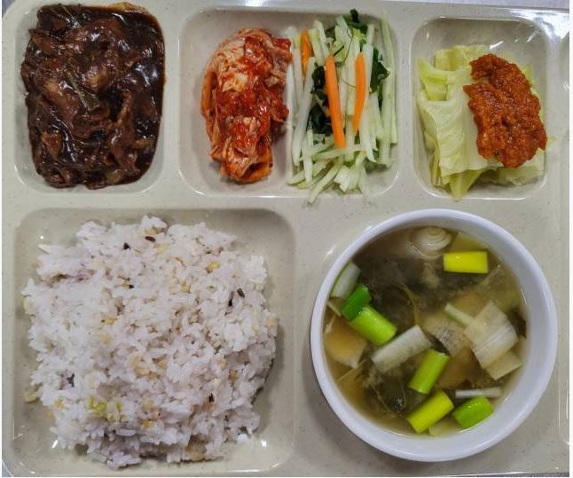 <석식 : 잡곡밥, 근대국, 돈육짜장볶음, 양배추쌈&쌈장, 해초무침, 배추김치>