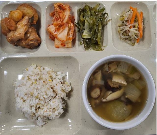 <10월 24일 석식 : 잡곡밥, 버섯맑은국, 닭볶음탕, 미역줄기볶음, 숙주나물, 배추김치>