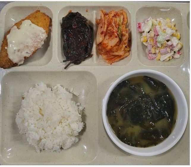 < 10월 24일 중식 : 백미밥, 미역미소국, 생선까스&타르타르소스, 양념깻잎지, 옥수수콘샐러드, 배추김치>