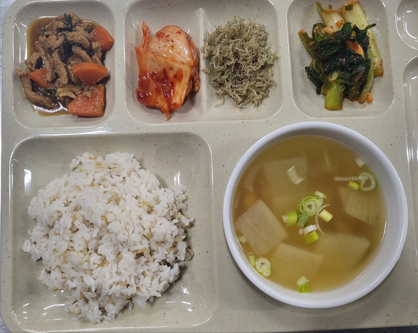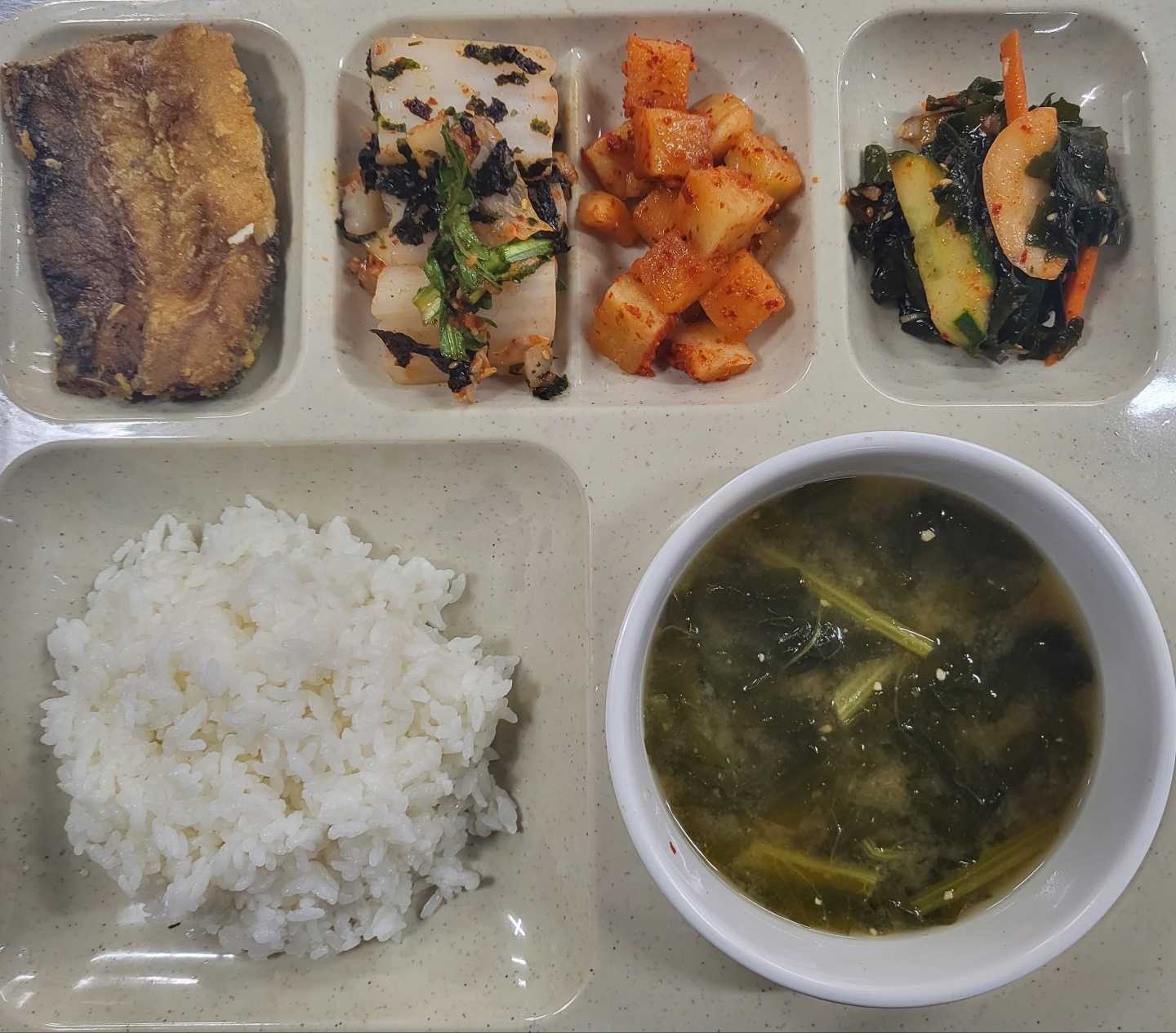 <10월 31일 석식 : 잡곡밥, 북어국, 돈육부추잡채, 멸치볶음, 얼갈이겉절이, 배추김치>