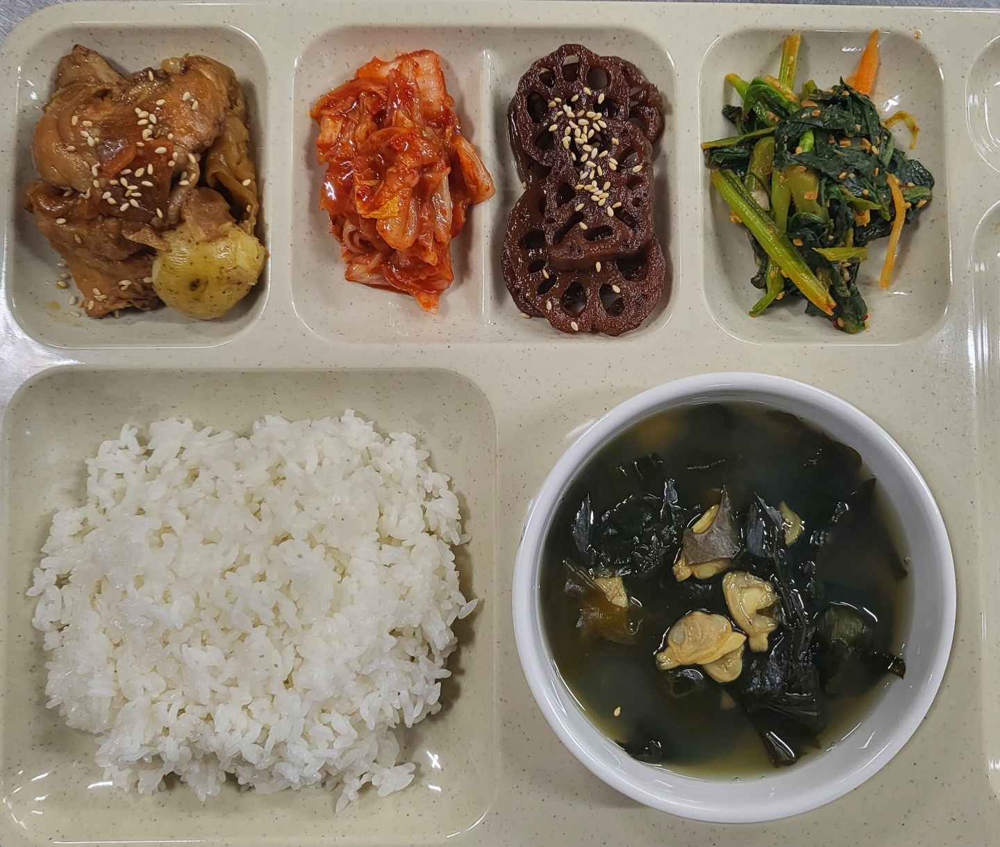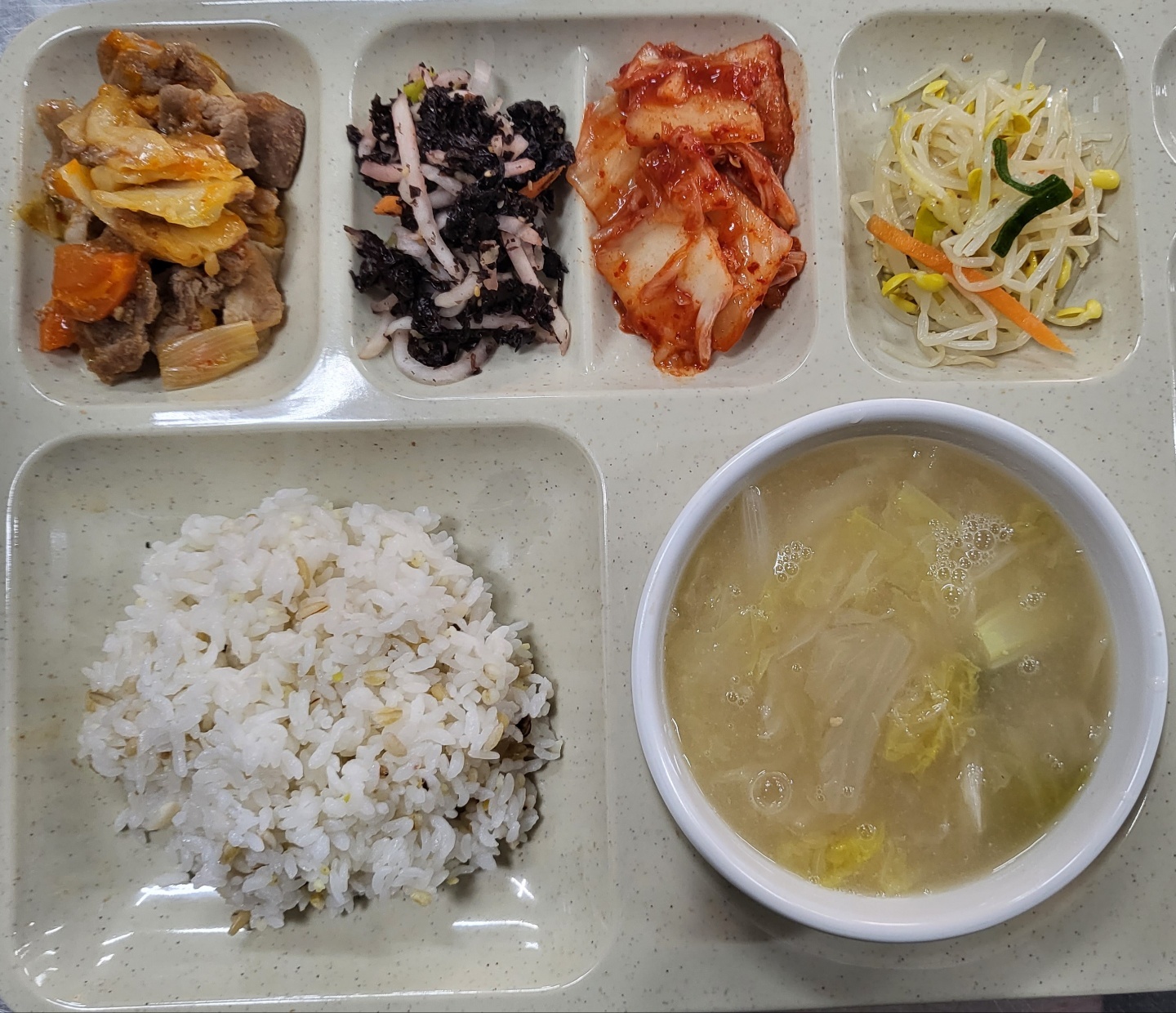 <석식 : 잡곡밥, 사골우거지국, 돈육두반장볶음, 건파래무무침, 콩나물무침, 배추김치>