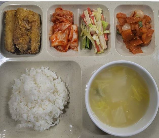 < 중식 : 백미밥, 사골배추국, 고등어구이, 게맛살오이냉채, 오복채락교무침, 배추김치 >