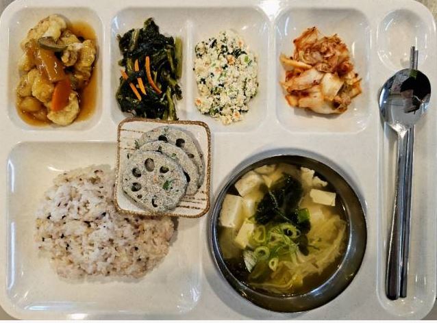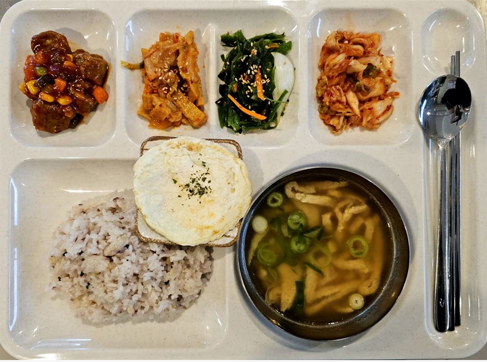 <중식 : 유부장국, 미트볼조림, 계란후라이, 해초샐러드, 김치오뎅볶음, 배추김치>