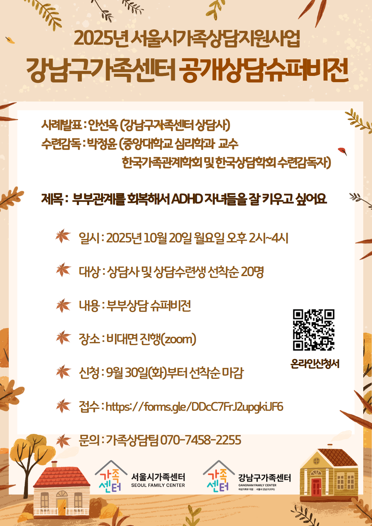 *신청완료 후에 별도의 연락 없이 슈퍼비전에 불참하는 경우, 추후 강남구가족센터 상담역량강화교육 및 공개슈퍼비전 신청에서 제외됩니다.