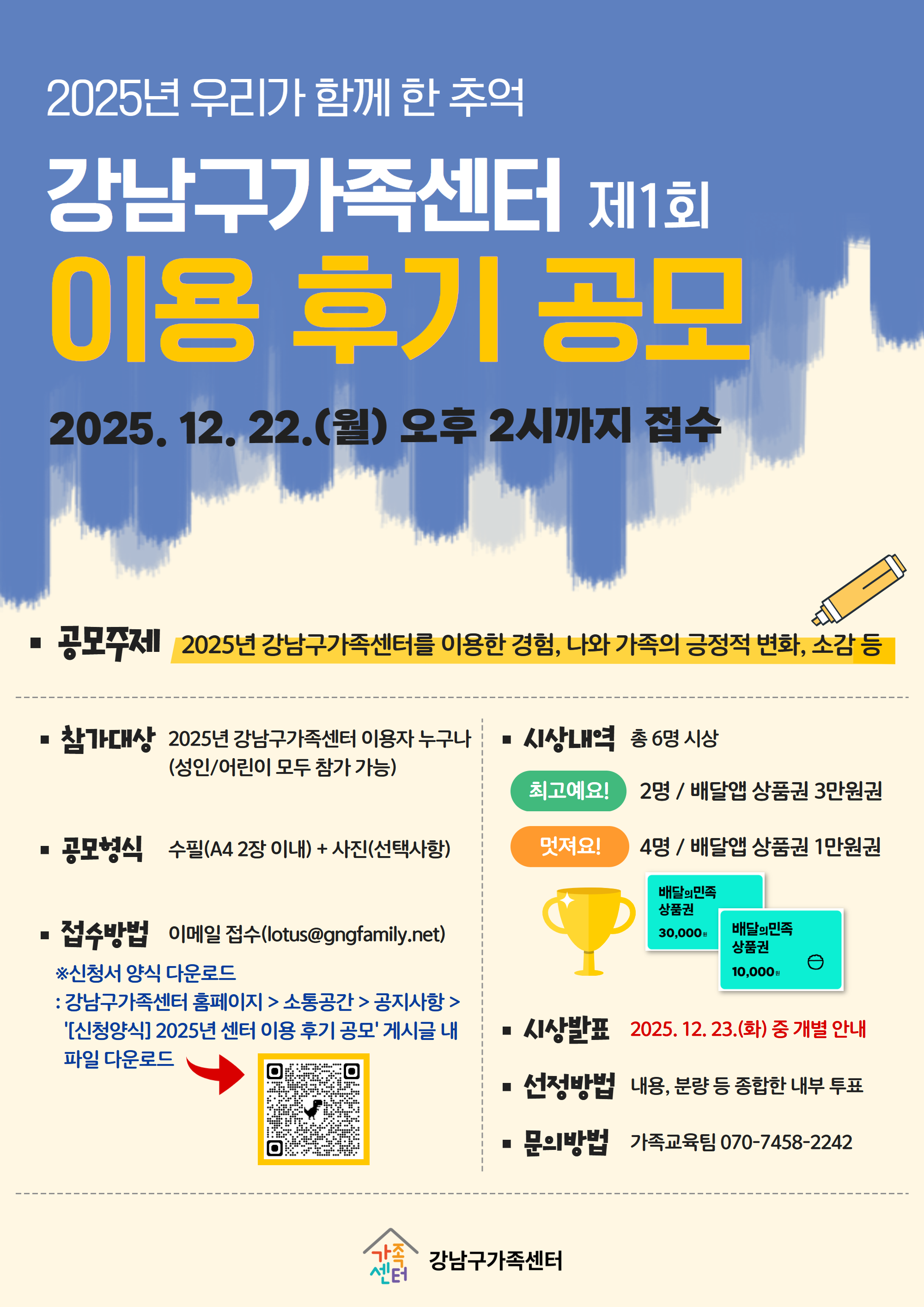 ○공모주제: 2025년 강남구가족센터를 이용한 경험, 나와 가족의 긍정적인 변화, 소감 등