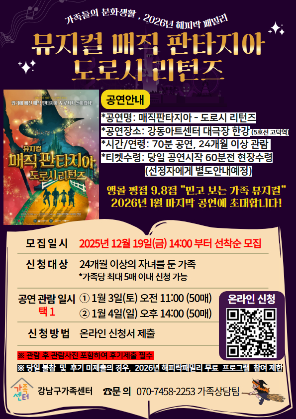 강남구가족센터 2026년 해피락패밀리 뮤지컬 공연 <매직판타지아- 도로시 리턴즈> 관람가족을 모집합니다.