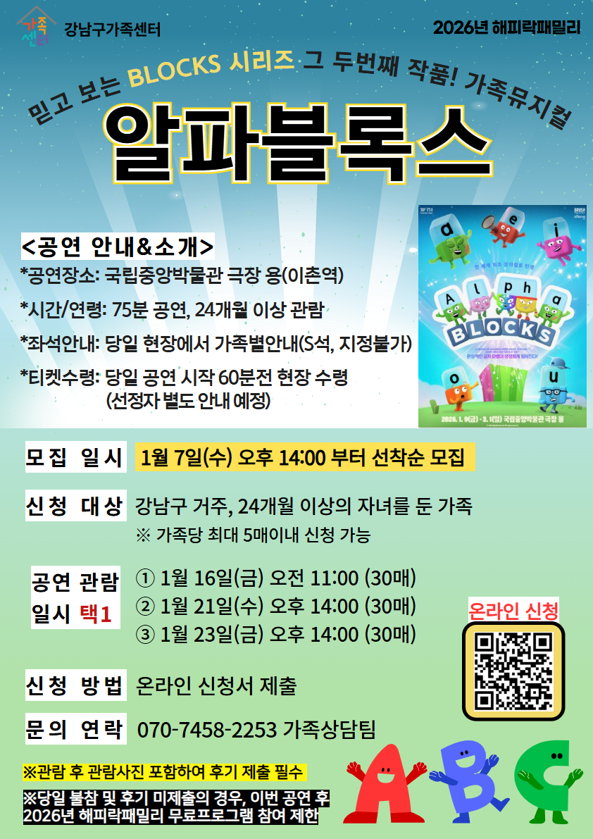 강남구가족센터 2026년 해피락패밀리. 세번째 가족 뮤지컬 <알파블록스> 관람가족을 모집합니다.