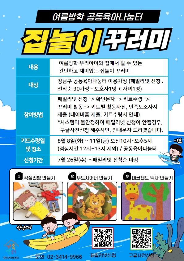 - 대상 : 강남구 거주 공동육아나눔터 이용가정 (부모-자녀 30가정 패밀리넷 신청 선착순)
