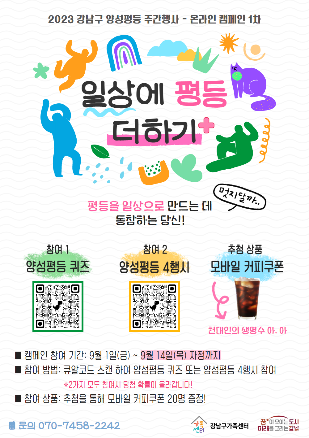 - 참여방법: 온라인 링크로 양성평등주간 퀴즈, '양성평등' 4행시 중 1개 이상 참여