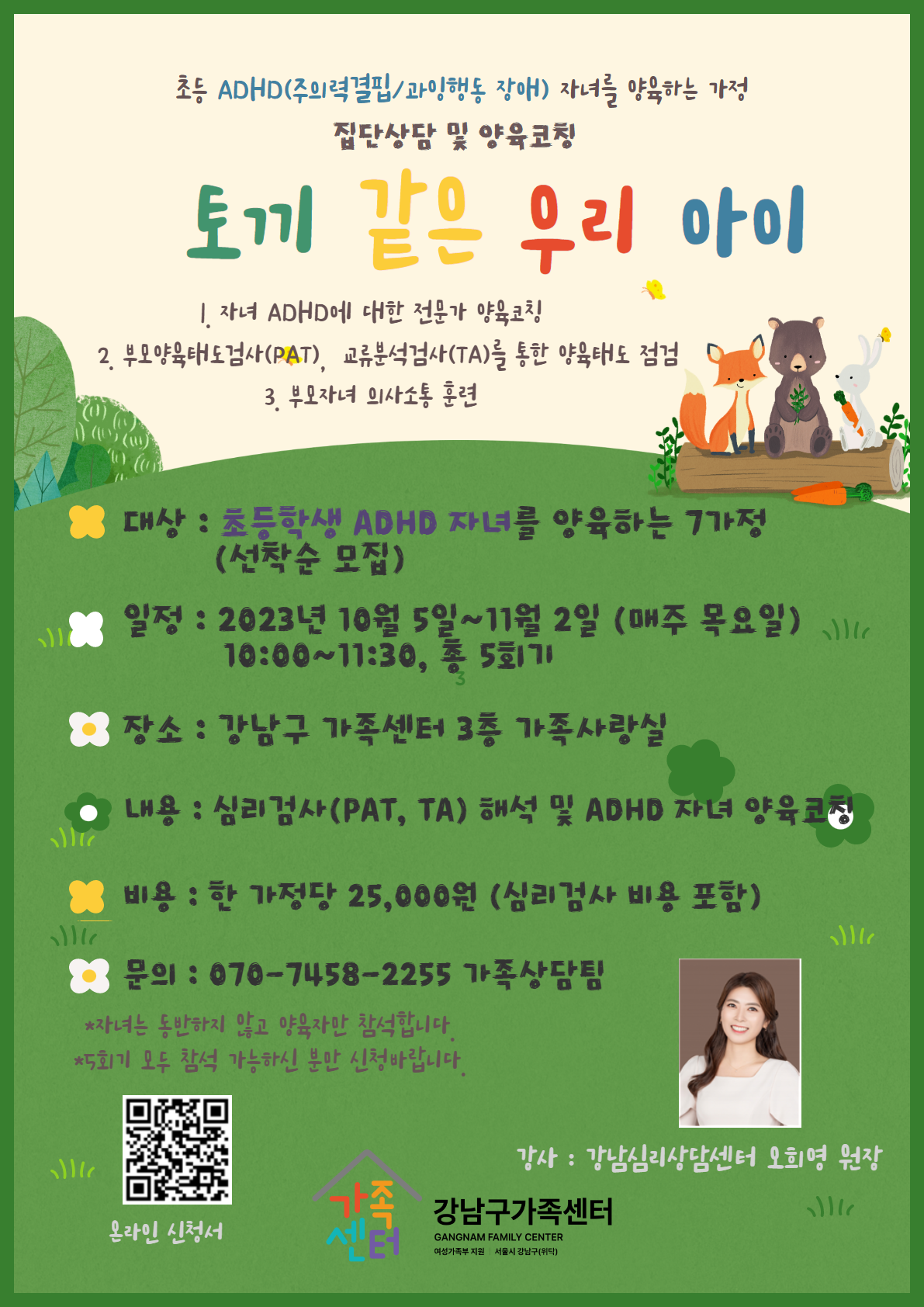 초등학교 1~6학년 ADHD(주의력결핍/과잉행동장애) 자녀를 양육하는 양육자의 집단상담 및 양육코칭 <토끼 같은 우리 아이> 참여자를 모집합니다.