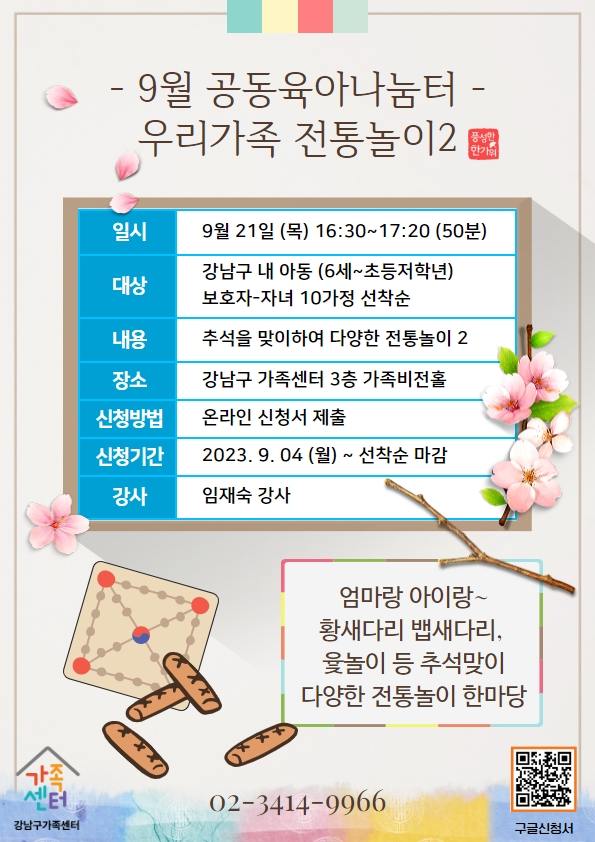 - 모집대상 : 강남구내 아동 6세~초등저학년 부모-자녀 10가정 *선착순 한정인원