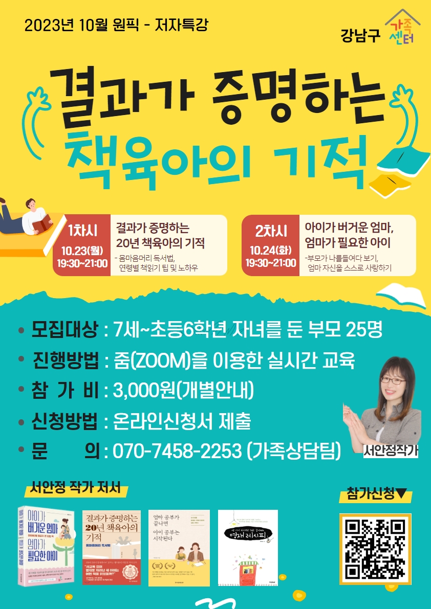 - 강사: 서안정작가(결과가증명하는 20년 책육아의기적, 아이가버거운 엄마, 엄마가필요한 아이의 저자)