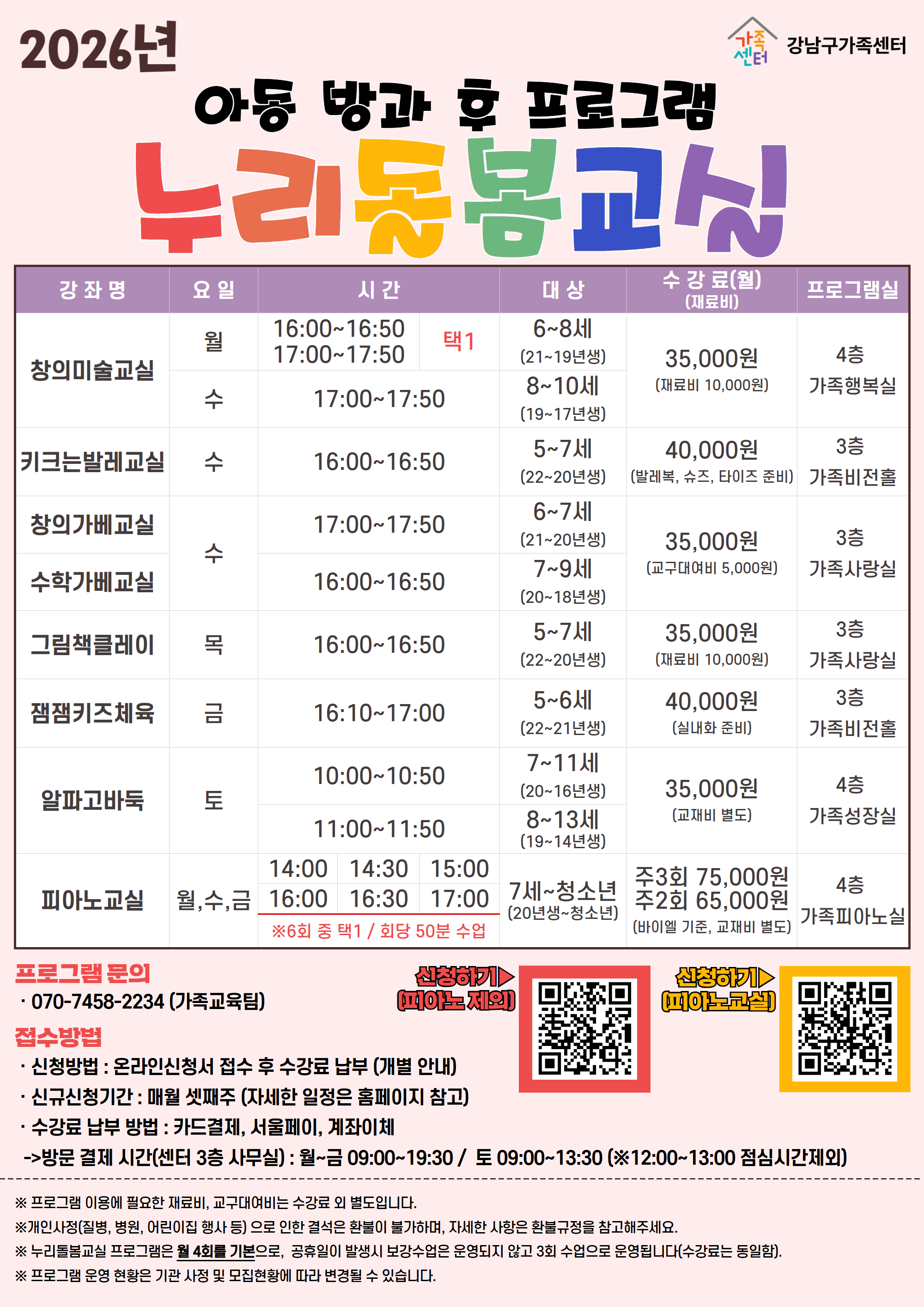 | 이용방법 | 1.신청과정 : 온라인 신청서 작성 → 대기 접수, 잔여석 확인 → 수강료 납부 → 등록완료 2.신청 링크 ※매월 셋째 주 중 신규 이용자 신청 진행 ▼피아노교실 신규신청 링크▼ https://forms.gle/efFLSVtAeVNrN1Lo9 ▼누리돌봄교실(피아노 제외) 신규신청 링크▼ https://forms.gle/niykkUXAC9UeVExaA |