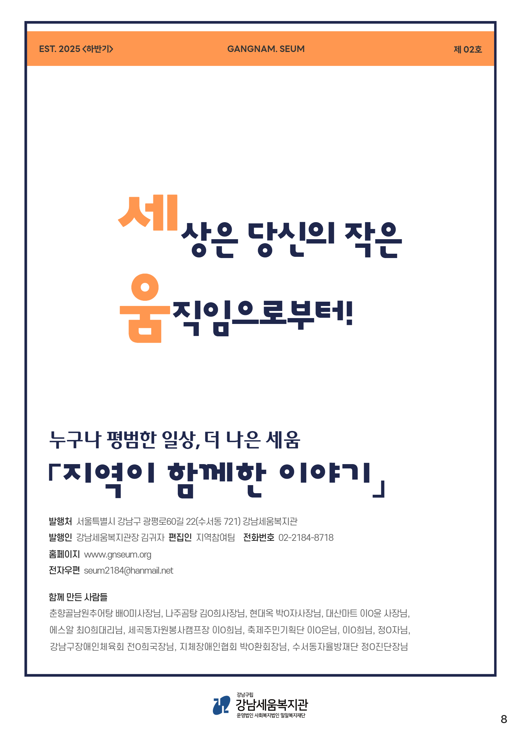 발행처 : 서울특별시 강남구 광평로 60길 22(수서동721) 강남세움복지관