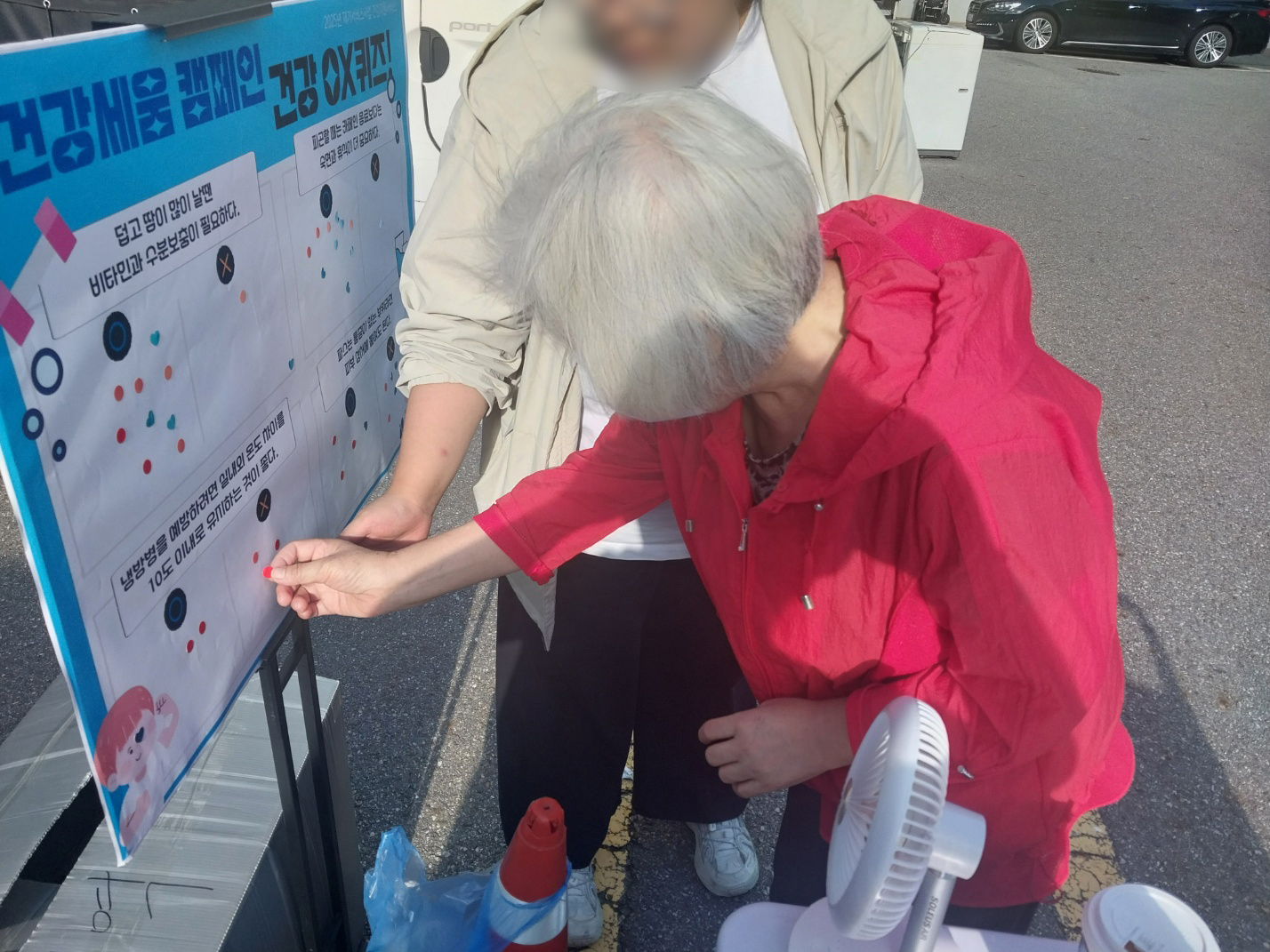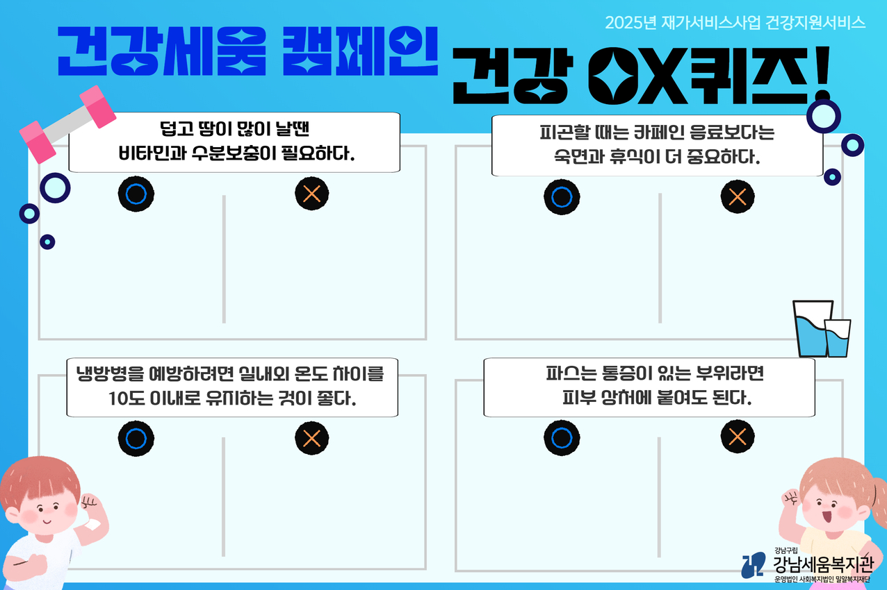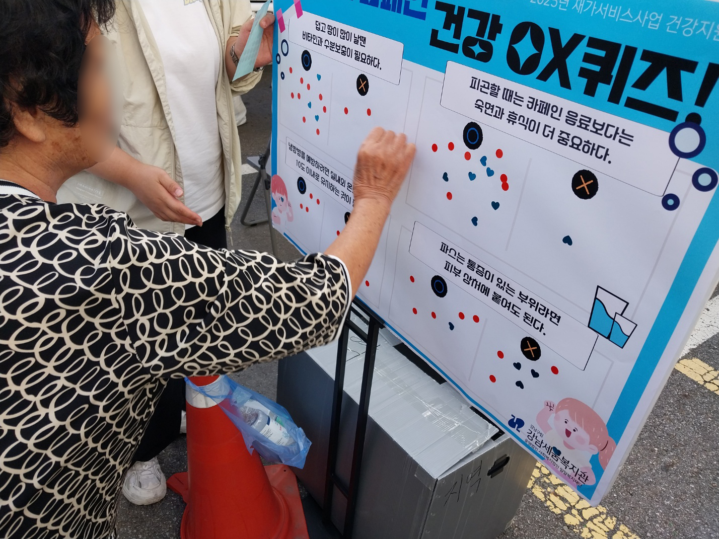 건강 OX 퀴즈를 통해 올바른 건강 정보를 확인하는 시간을 가지며, 퀴즈에 참여하는 분께는 파스, 소화제, 피로회복제로 구성된 건강키트를 전달하였습니다. 건강키트는 일상에서 바로 활용할 수 있어 참여자들의 만족도가 높았습니다.