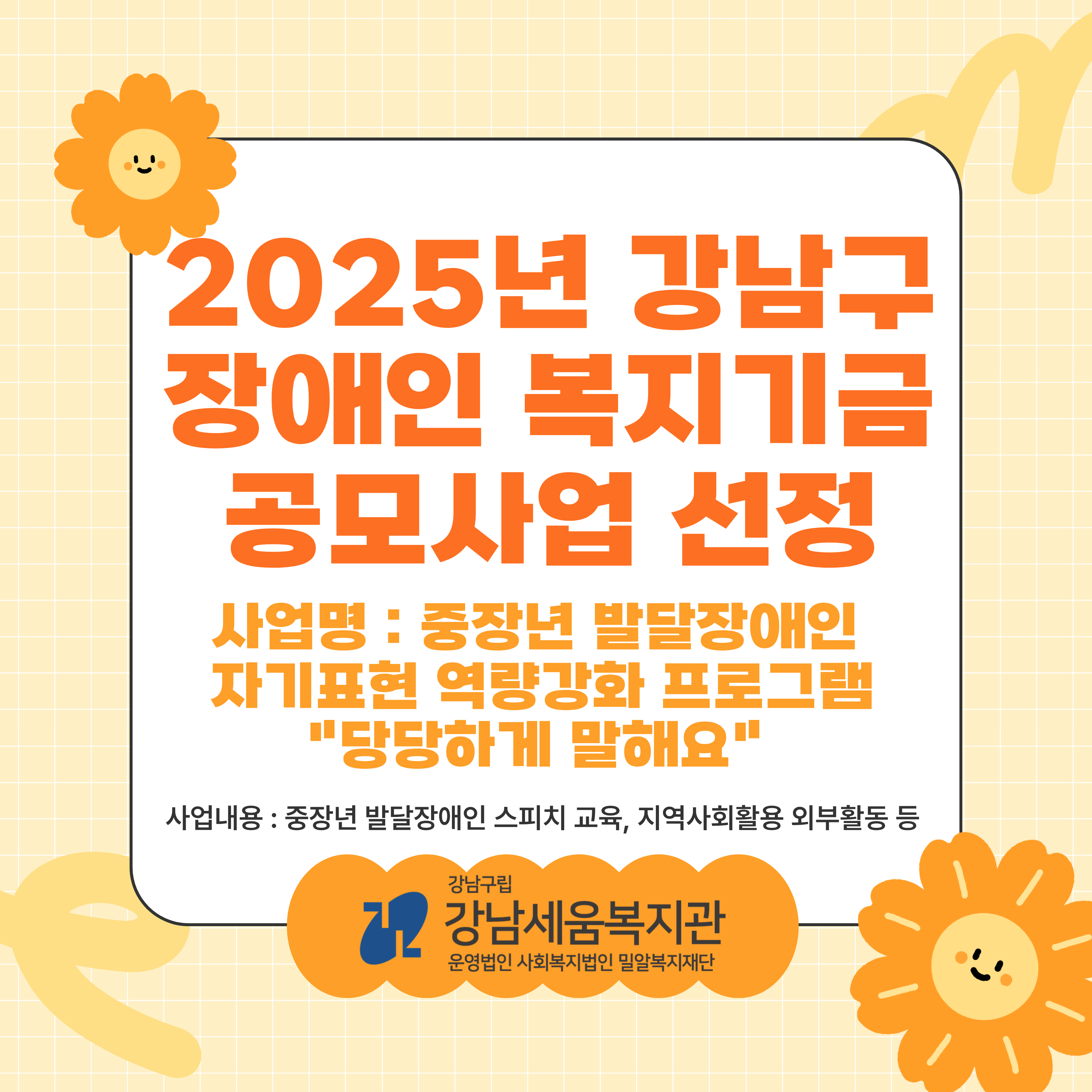 - 사업명 : 2025년 강남구 장애인 복지기금 공모사업 선정 ‘중장년 발달장애인 자기표현 역량강화 프로그램’ - “당당하게 말해요”