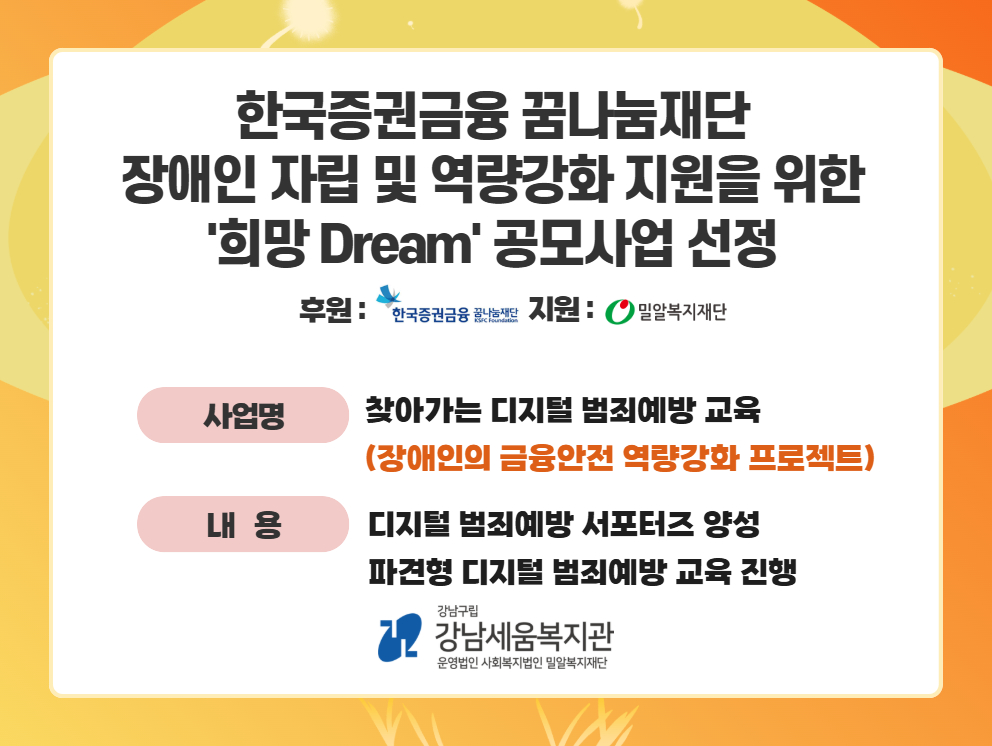 2025년 12월 24일 강남세움복지관은 한국증권금융꿈나눔재단 후원, 밀알복지재단에서 지원하는 장애인 자립 및 역량강화 지원을 위한 ‘희망Dream’ 공모사업에 선정되었습니다.
