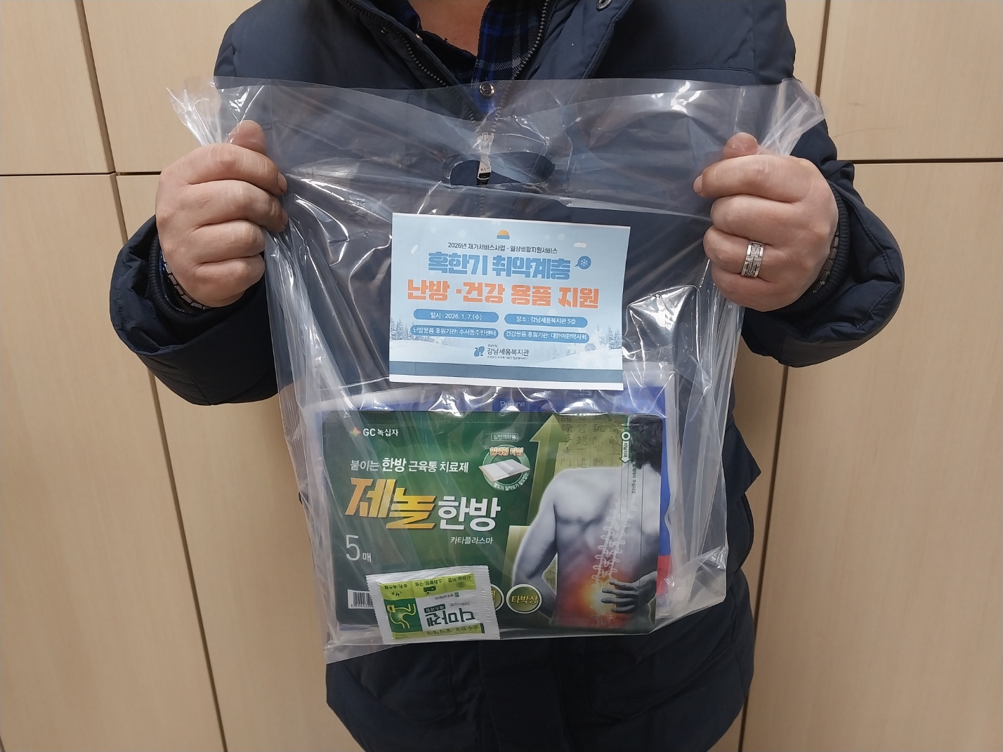 강남세움복지관 맞춤형서비스팀에서는 1월 7일(수) 사례지원 및 재가서비스 참여자 100명을 대상으로 혹한기 취약계층 난방 및 건강용품 지원을 진행하였습니다. 이번 지원은 추운 겨울을 보다 따뜻하고 건강하게 보낼 수 있도록 핫팩, 파스, 소화제 등으로 구성하여 전달하였습니다.