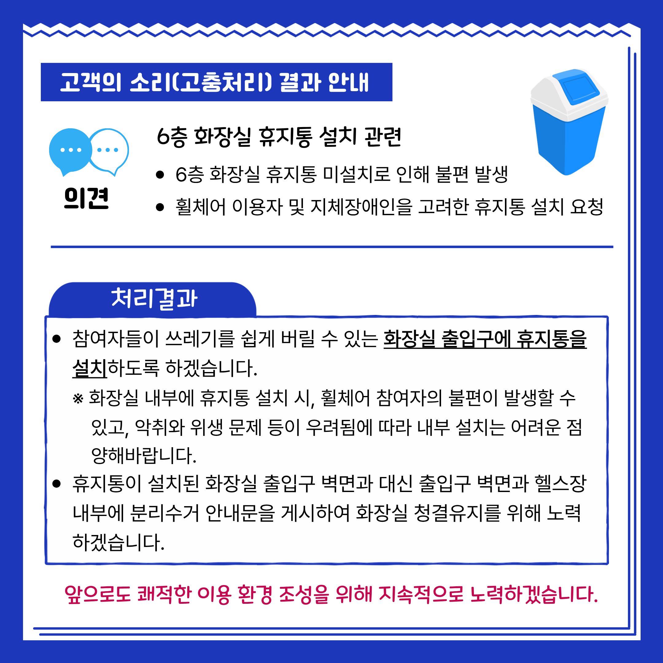 - 앞으로도 쾌적한 이용 환경 조성을 위해 지속적으로 노력하겠습니다.