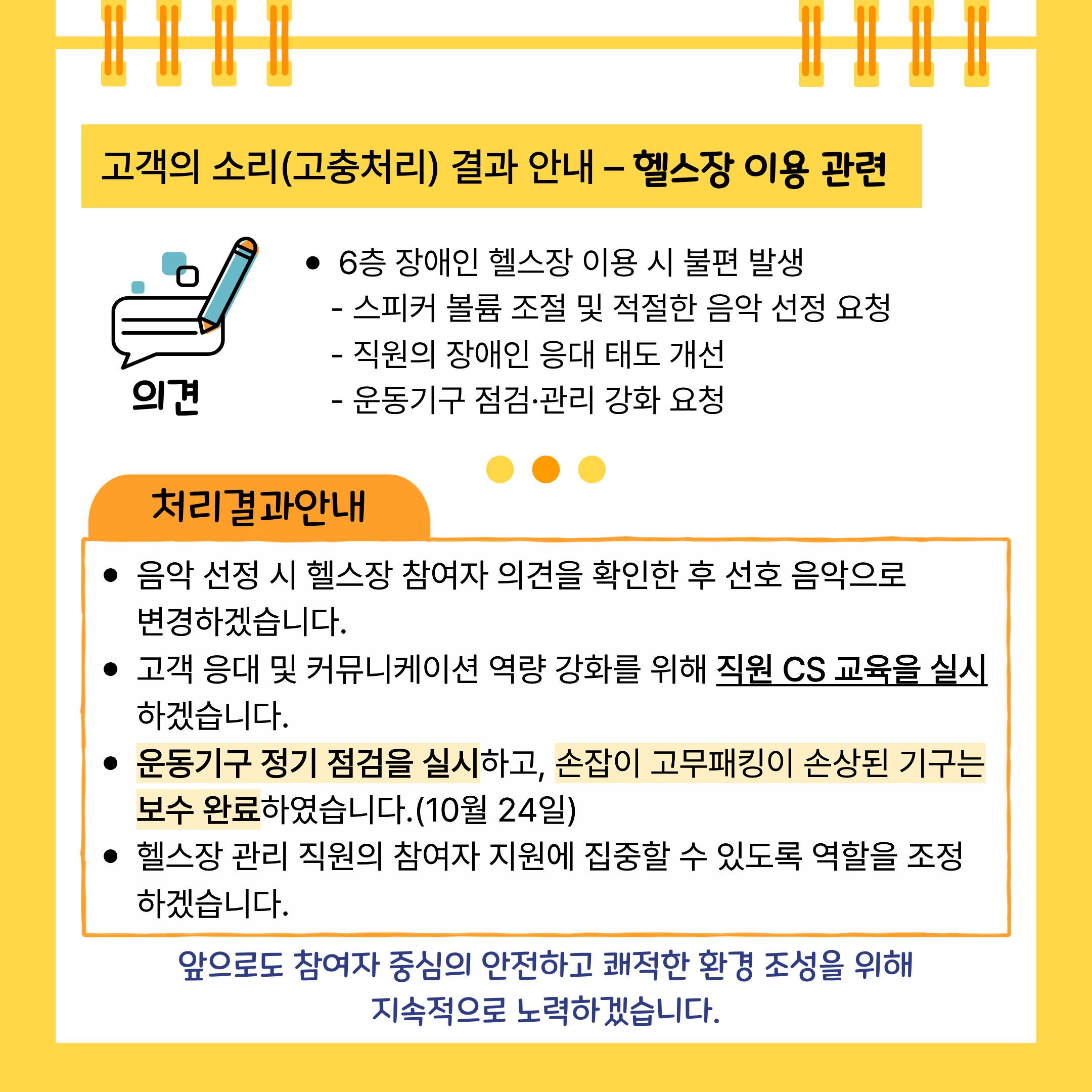 - 직원의 장애인 응대 태도 개선 및 운동기구 점검·관리 강화 요청