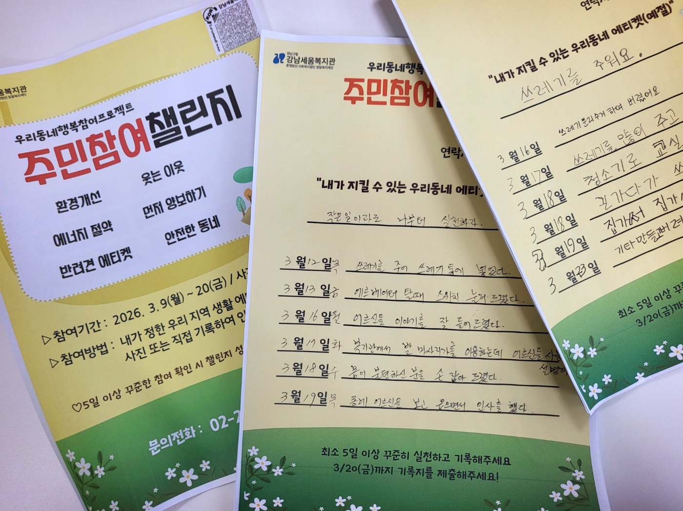 우리동네행복참여프로젝트 주민참여챌린지 “내가 지킬 수 있는 우리동네 에티켓(예절)”을 주제로 진행되었습니다. 주민이 직접 더 나은 우리 지역을 위한 에티켓을 정하고 꾸준히 실천하며 지역사회 발전을 위한 긍정적 문화가 자리매김할 수 있도록 함께 노력하였습니다. <작은 일이라도 나부터 실천하기>, <반려견 에티켓 지키기>, <웃는 얼굴로 먼저 인사하기> 등 주민들의 자발적인 참여를 통해 살기 좋은 우리 지역을 만드는데 앞장서는 소중한 기회가 되었습니다.