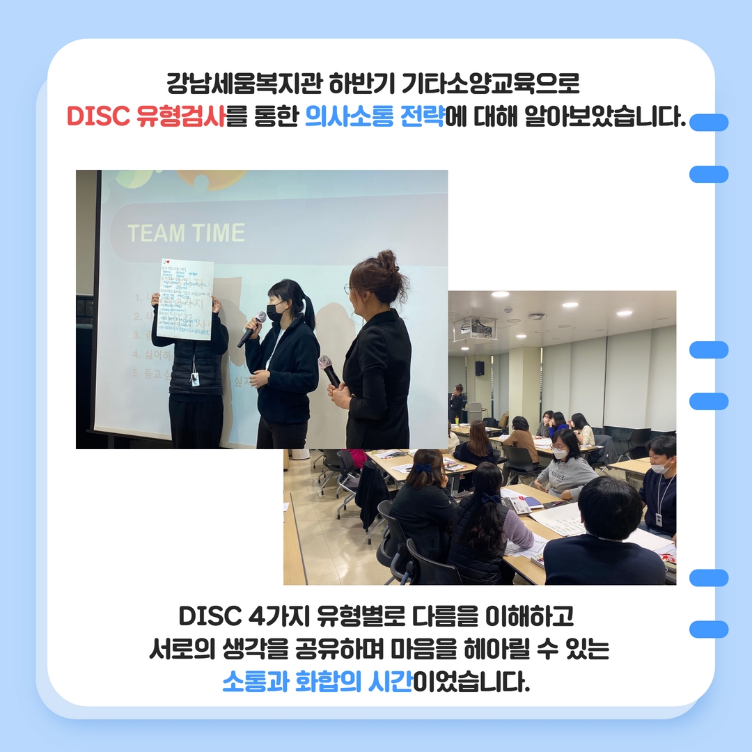 강남세움복지관 하반기 기타소양교육으로 DISC 유형검사를 통한 의사소통 전략에 대해 알아보았습니다. DISC 4가지 유형별로 다름을 이해하고 서로의 생각을 공유하며 마음을 헤아릴 수 있는소통과 화합의 시간이었습니다.