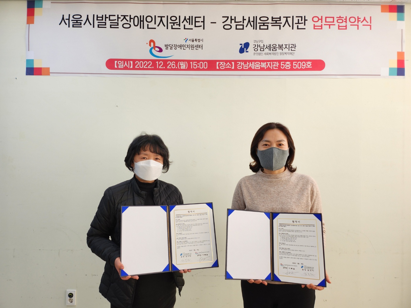 12월 26일(월) 강남세움복지관(관장 김귀자)과 서울시발달장애인지원센터(센터장 이복실)는 상호협력 체계 구축을 위한 업무협약을 진행하였습니다.