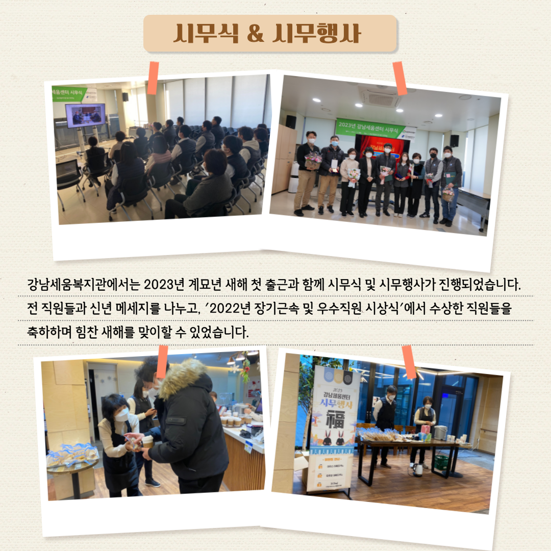 강남세움복지관에서는 2023년 계묘년 새해 첫 출근과 함께 시무식 및 시무행사가 진행되었습니다.